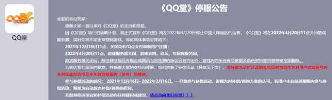 QQ堂今日正式停運(yùn) 參與補(bǔ)償活動(dòng)的時(shí)間:2021年12月16日-2022年2月16日 ... [更多詳細(xì)]
