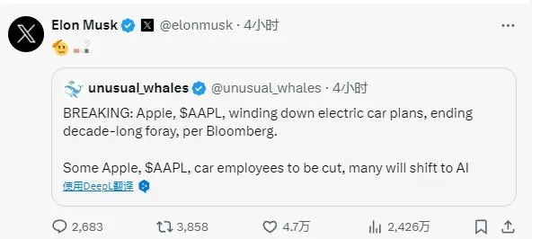 馬斯克用兩個表情回應蘋果取消造車:敬禮和抽煙 ... [更多詳細]