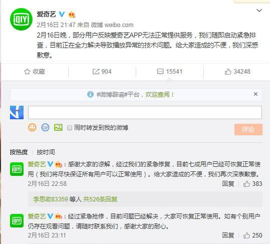 愛奇藝回應(yīng)系統(tǒng)崩潰:問題已解決,已恢