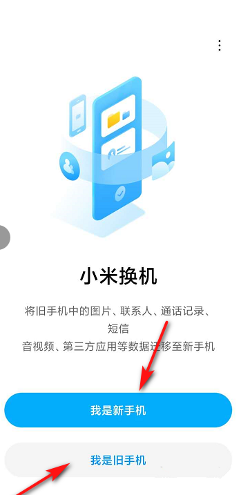 小米換機(jī)功能支持將舊手機(jī)中的圖片、聯(lián)系人、通話記錄、短信、音視頻等數(shù)據(jù)遷移至新手機(jī),如圖,根據(jù)實(shí)際情況來選擇新舊手機(jī),