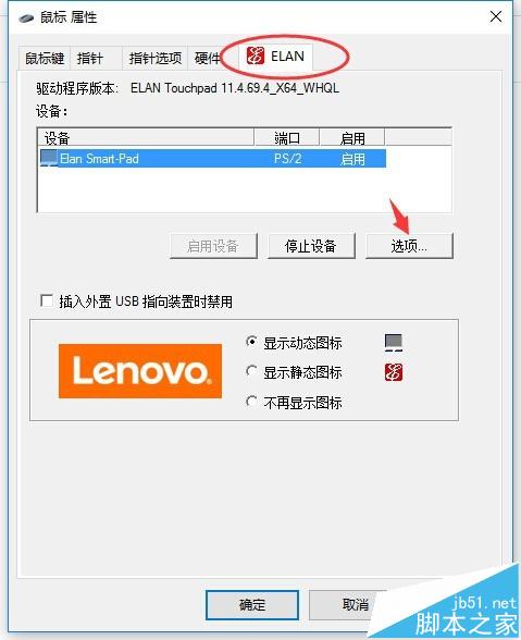 2、點擊最后一個“Elan”選項卡,點擊“選項”。