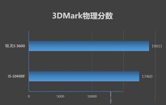 在3DMark物理分數測試中,i5 10400F的物理分數為17460,R5 3600的分數為19011。R5 3600比i5 10400F高了1551分,領先幅度為9%。