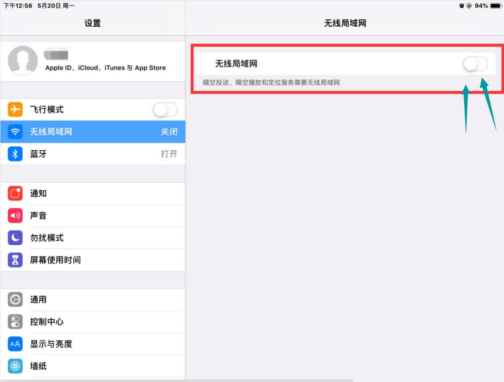 1、網(wǎng)絡(luò)不好也會(huì)導(dǎo)致喊嘿,Siri的時(shí)候不出來(lái),我們現(xiàn)在打開iPad的設(shè)置界面,點(diǎn)擊無(wú)線局域網(wǎng)圖標(biāo),將網(wǎng)絡(luò)關(guān)閉。
