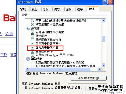 2、既然提到了瀏覽器,那么就不得不提下IE了,作為老牌的瀏覽器,現在仍然保留著眾多的用戶群,而且很多瀏覽器也是基于IE內核的。在IE的高級選項中有一個多媒體選項,其中就有一項是控制網頁聲音的,如果未勾選,那么基于IE內核的所有瀏覽器均不會聽到任何聲音,默認自然是勾選的,但是以防萬一還是查看下為好。
