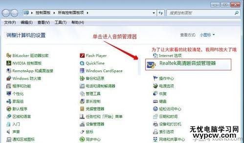 進(jìn)入控制面板后,找到Realtek高清晰音頻管理器,注意紅色框框就是哦!這種面板的查看方式是“小圖標(biāo)”如果用這種方式打開(kāi)的話(huà)呢!就少了一個(gè)步驟哦,就看大家喜歡用哪一種比較習(xí)慣嘍!