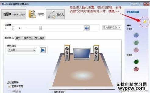 最重要的步驟非這它莫屬啦!進(jìn)入音頻管理器后(前面兩種查看方式進(jìn)入后都是一樣的哦),找到如圖中所示長(zhǎng)得很像“文件夾圖標(biāo)”的音頻插孔設(shè)置單擊進(jìn)入設(shè)置,選擇第一個(gè)選項(xiàng),聲音的世界來(lái)臨啦!聽(tīng)歌去,GO GO~ ~