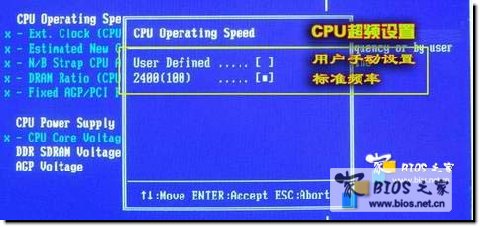 好了,言歸正傳,繼續Bios設置,在你選擇“CPU Operating Speed”中的“Use Defined”選項后,你會看到以前不可以選的CPU選項現在已經可以進行設置了!