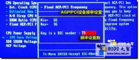 這就是外頻調節設置選項,手動輸入想設置成的CPU外頻數值,在此允許輸入數值范圍在100-412之間,可以以每1MHz的頻率提高進行線性超頻,最大限度的挖掘CPU的潛能。一般上CPU的外頻在100至250左右較為正常,一般不會超過300MHz,所以用戶千萬不要一次性把外頻調到最高,原則上來講,第一次超頻CPU因為不清楚CPU究竟可以在多高的外頻下工作,因此設置外頻的數值可以以三至五兆赫茲為臺階提高來慢慢試驗,在此為了示范,直接將外頻設置成了133MHz這個標準外頻,設置了正確的外頻數字以后再按回車鍵確定。
