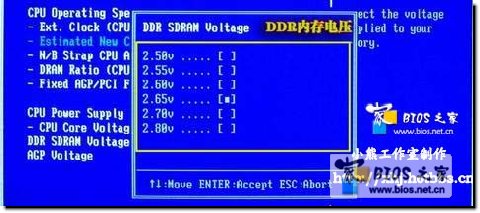 就是來提高給DDR內存供電的電壓,DIMM模組的默認電壓為2.5V,如果內存品質不好,或是超頻了內存,那么可以適當提高一點內存電壓,加壓幅度盡量不要超過0.5V,不然則有可能會損壞內存!