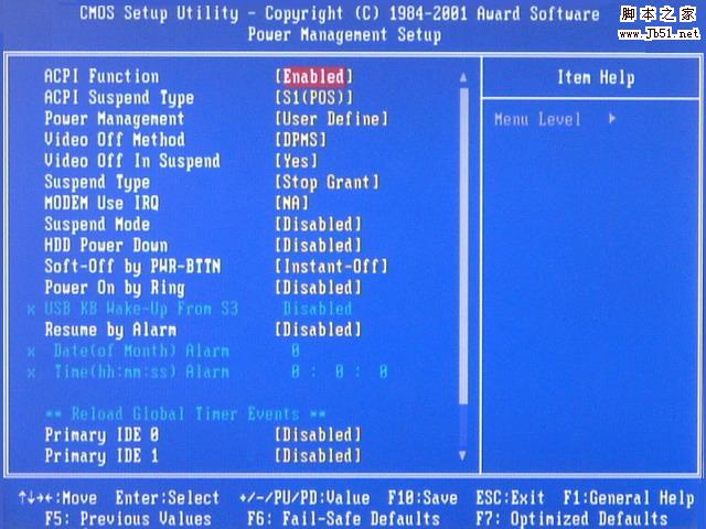 FDD,COM,LPT Port(設置當軟驅,串行口,并行口有存取要求時,是否取消目前PC及該IDE的省電狀態(tài))缺省值為Disabled (禁用)。