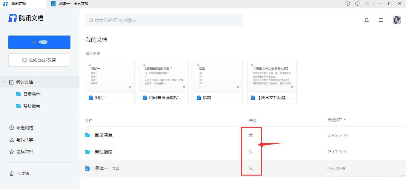 在騰訊文檔-我的文檔界面中,文檔對應“來自”一欄中會顯示為“我”,則為文檔的創建者。