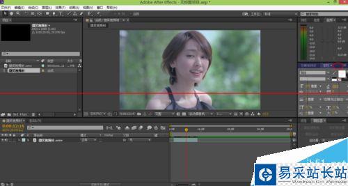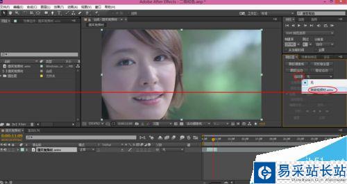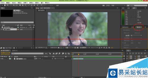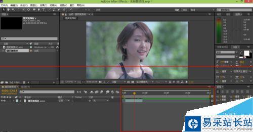 4、我們選取視頻中的一部分做演示,為了工作方便,我們把工作區調節到和剪輯后的視頻時間長度。操作步驟:在圖中紅色矩形方塊中右鍵(如果不行,就先拖動以下工作區兩側黃色的東西,任意一個就行)---將合成修剪至工作區域。
