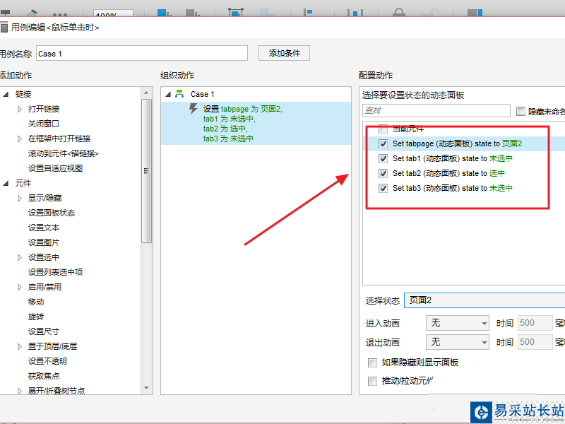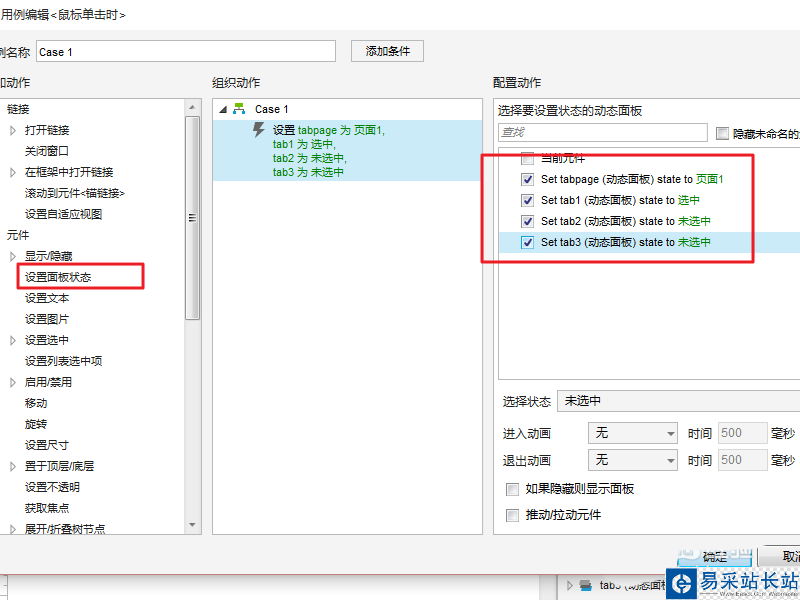 9、根據圖示,設置tab1/tab2/tab3的交互事件,添加思路:點擊tab1設置 tab1狀態為選中,其他為非選中,設置tabpage為頁面1,依次類推,進行設置:
