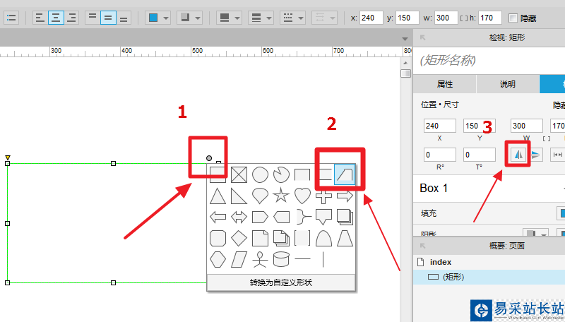 2、設置元件大小,并在選中元件后右鍵,將元件轉換為動態面板:詳細見下圖
