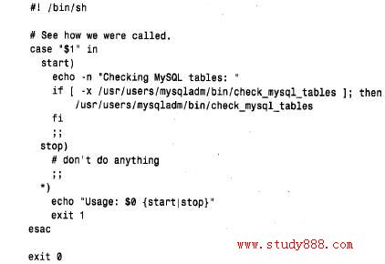 如果正在使用System V 風格的啟動方法從/etc/rc.d 目錄之一中調用mysql. server,則過程稍有點復雜。這些目錄中的啟動腳本應該理解start 和stop 參數的含義,以便對系統的啟動和關閉采取相應的操作。為了執行表的檢查,我們可以編寫這樣的腳本:當參數為start 時調用c h e c k _ mysql_ tables,而當該參數為stop 時不做任何事情。讓我們來調用這樣的一個腳本mysql. c h e c k,其內容如下: