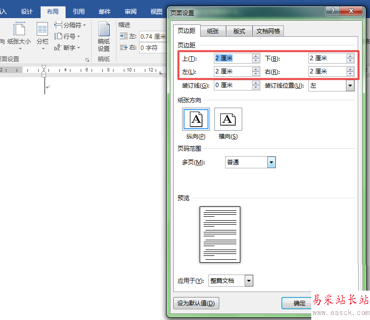 1、首先設置頁邊距,將上下左右全部改為2,文檔網格指定為無網格。