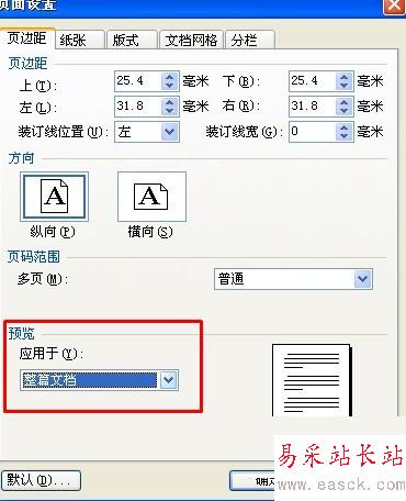 3、在【頁面設置】對話框中,可以看到上方是設置頁邊距的數(shù)值,有上、下、左、右四邊,可以分別設置不同的數(shù)值,數(shù)值越少頁邊距越短;下方是根據(jù)設定的數(shù)值進行預覽,默認應用于整篇文檔。