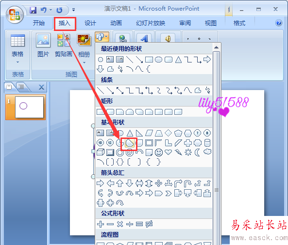 3、當一圓形的圖標繪好后,再次點擊【插入】選擇【半圓形】的形狀,如圖所示;
