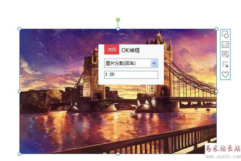 2、選擇圖片,執行onekey-ok神框命令,從下拉菜單中選擇圖片分割選項,設置參數為1 20,按回車鍵進行分割。