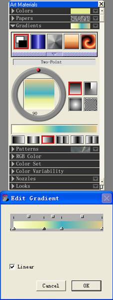 4.選擇畫布層,添加漸變色,先打開art materials的gradients面板,選擇two-point,把圓圈中的小紅點移到頂端。點擊面板內左上方小三角,點擊edit gradients,在出現的菜單中的色條中點進左邊第一個小三角,然后在colors面板中選擇一種十分接近白色微黃色的顏色,然后在色條中間稍靠左下方點擊,再建立一個漸變點,選擇一種比剛才稍偏黃一點的顏色,色條中部,建立一個新的漸變點,選擇一種偏藍的深綠色,再點擊最右邊的小三角,選擇一種較暖的褐色,點擊ok。(見圖二)