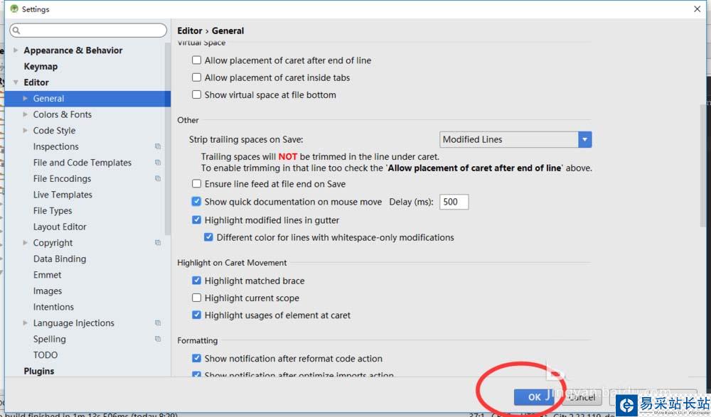 5、點擊右下角OK按鈕,關閉設置界面。此時光標移動到代碼上應該就會有提示框了。