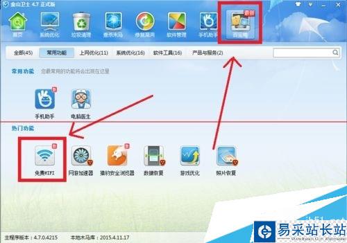 2、進(jìn)入金山之后我們點(diǎn)擊右上角最后一個(gè)功能,“百寶箱”,進(jìn)入百寶箱之后可以看到很多關(guān)于金山的一些功能軟件的推薦。這里我們直接點(diǎn)擊“免費(fèi)wifi”,如圖所示: